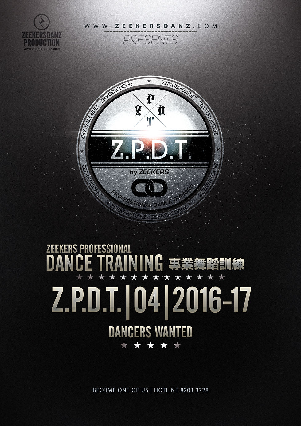 全新年度《Z.P.D.T.04 | 2016-2017》專業舞蹈訓練計劃現正招生! Hotline: 8203 3728 -協助學員成為專業舞蹈員及導師 -成為Zeekers Danz 表演團隊,參與各類商演 -入選Dance Crew,免費提供排舞及場地練習,參加各項舞蹈比賽 -完成整個訓練課程可獲畢業證書 -優秀學員將獲得奬學金資助到外地深造 -專業導師教授, 全方位舞蹈訓練: Jazz.Hip-Hop.Contemporary.Jazz Funk.Urban Dance.Ballet.Popping.Waacking.Choreography